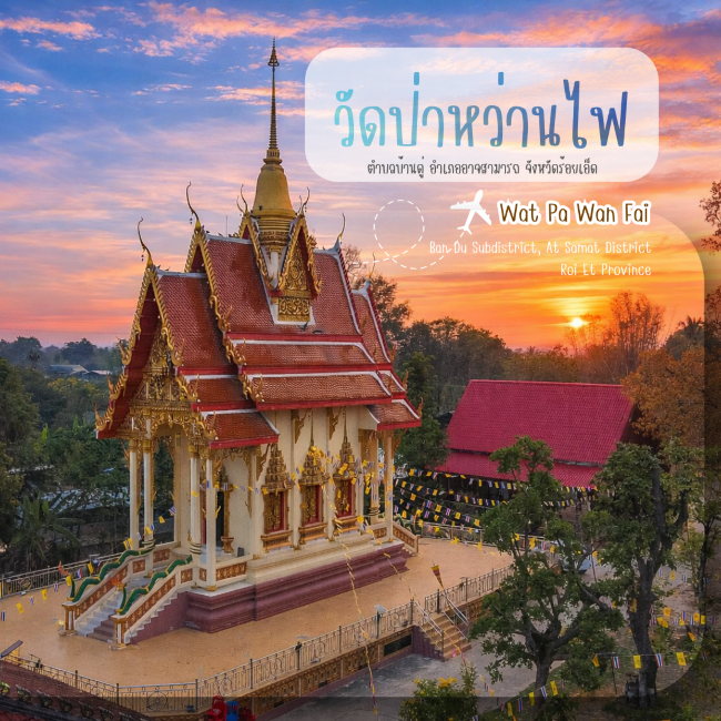 วัดป่าหว่านไฟตั้งอยู่เลขที่ ๓๕ บ้านหว่านไฟ หมู่ที่ ๘ ตำบลบ้านดู่ อำเภออาจสามารถ จังหวัดร้อยเอ็ด สังกัดคณะสงฆ์มหานิกาย ที่ดินตั้งวัดมีเนื้อที่ ๗ ไร่ ๒ งาน ๙๑ ตารางวา มีที่ธรณีสงฆ์จำนวน ๔ แปลง เนื้อที่ ๔ ไร่ ๓ งาน ๗๓ ตารางวา สิ่งสำคัญของวัดประกอบด้วย