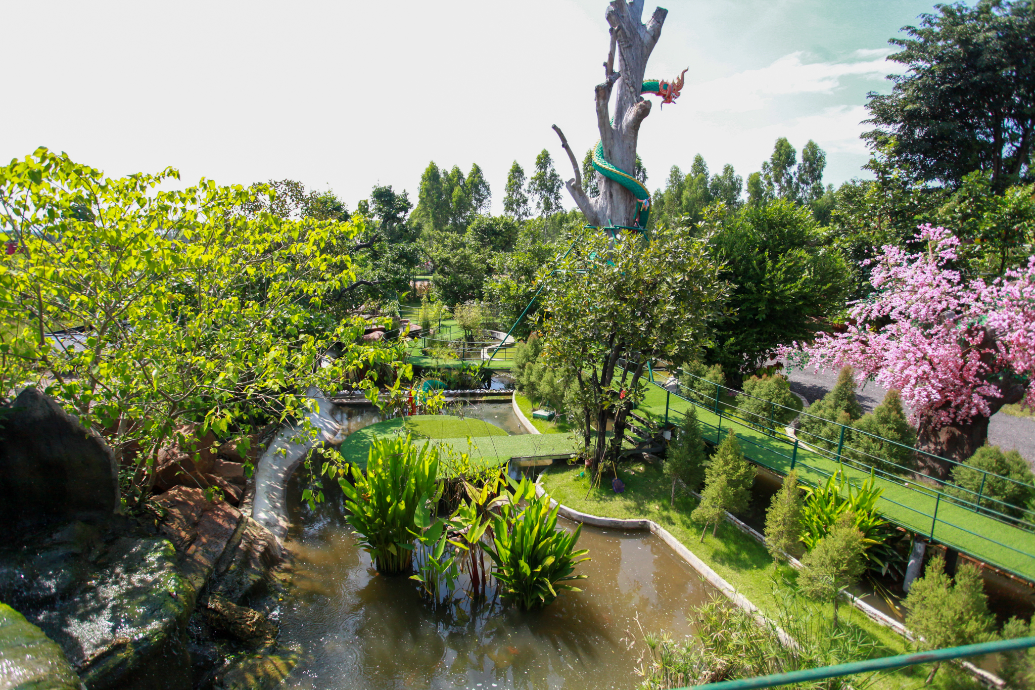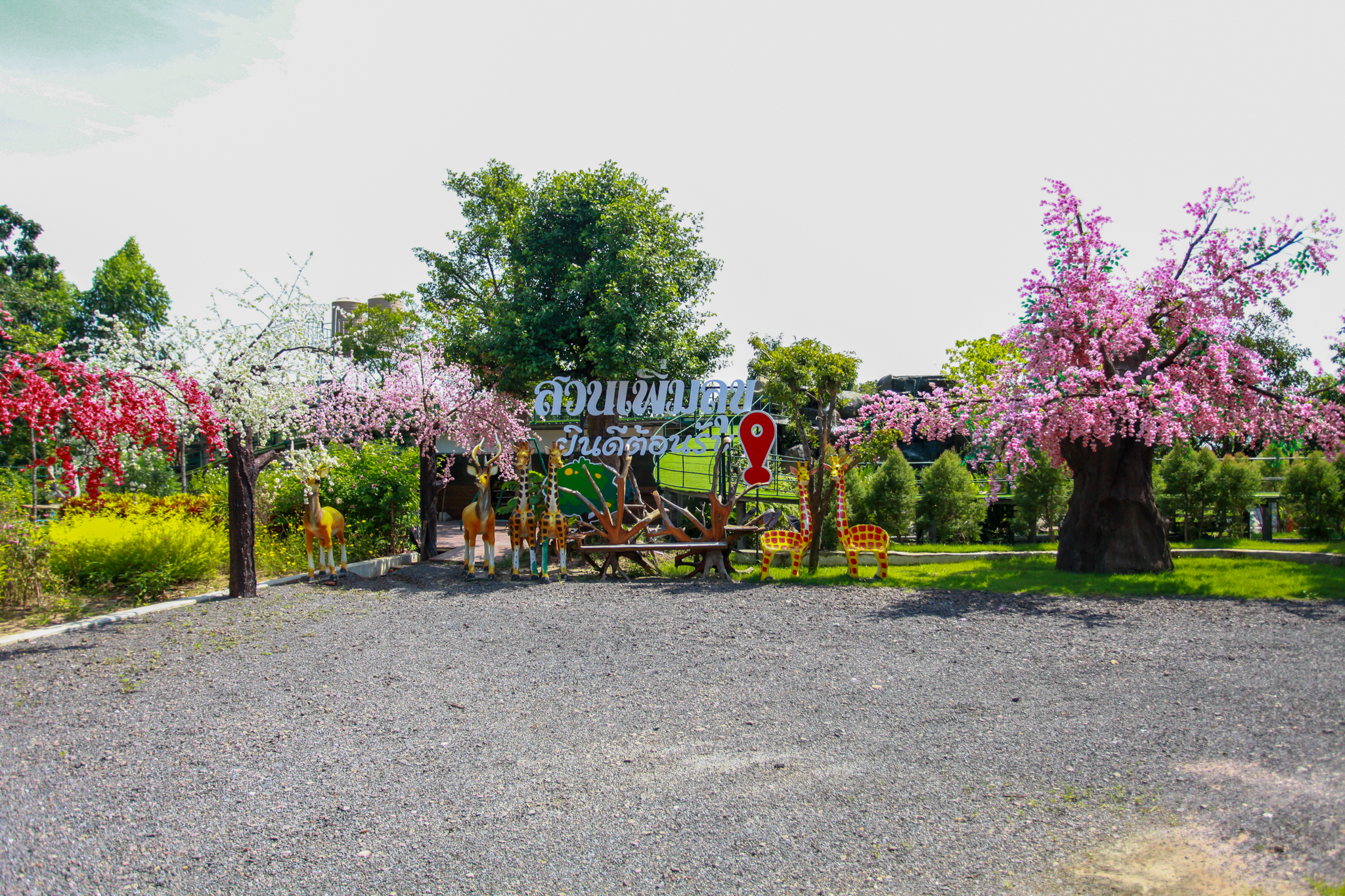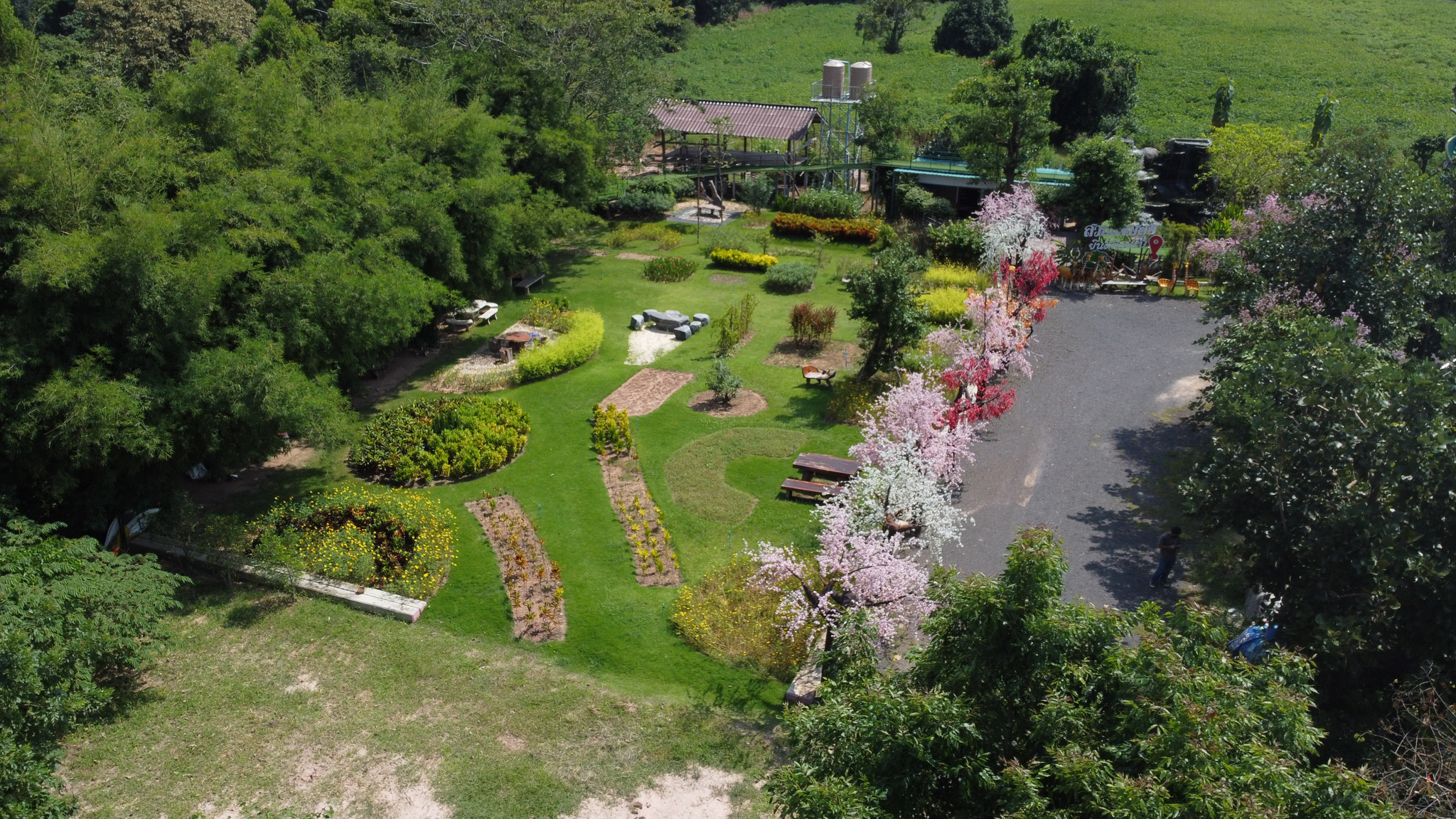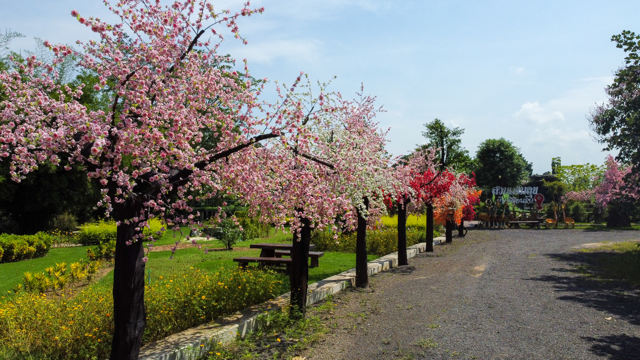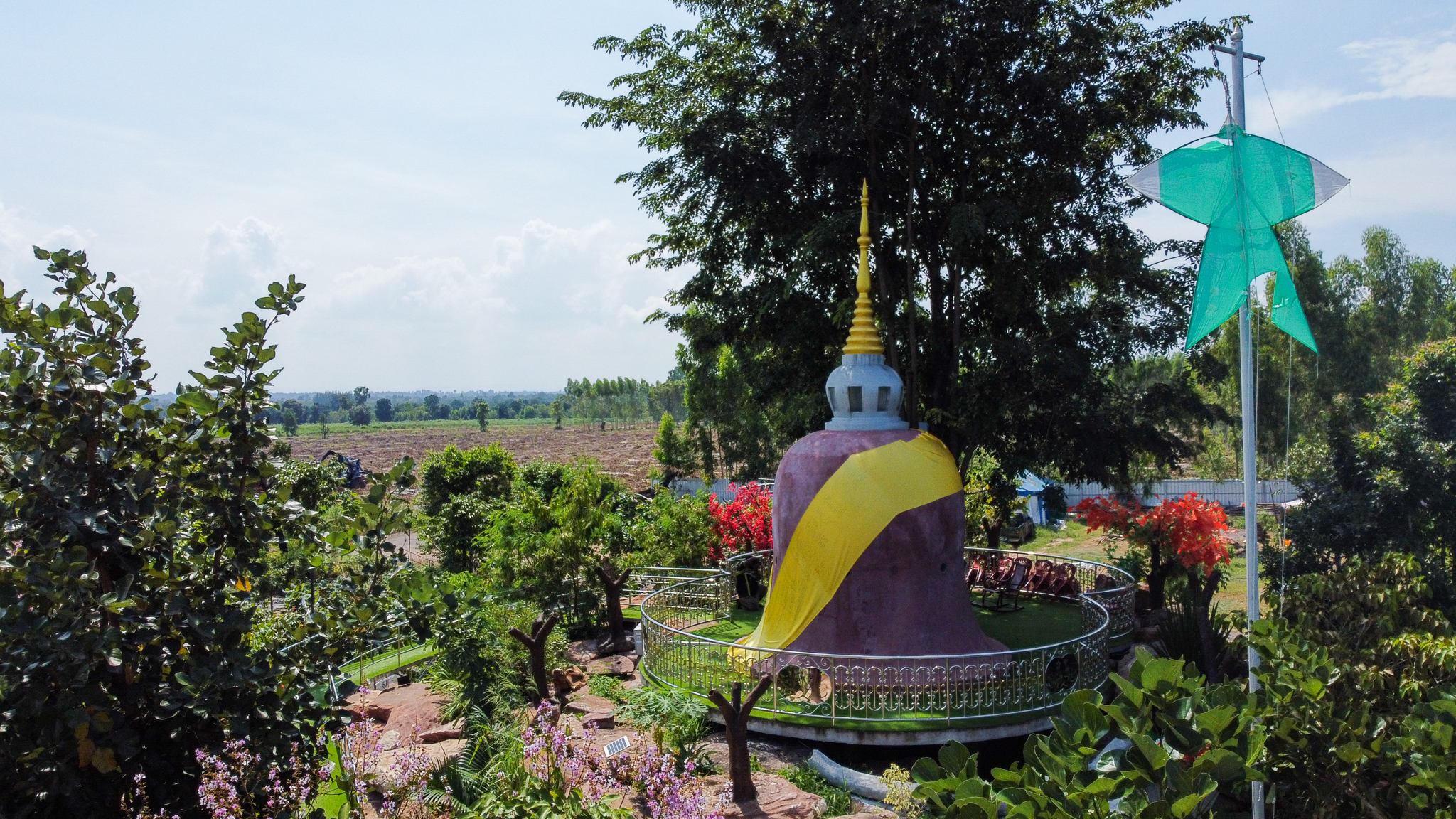 “เมื่อมีลูกศิษย์มาปฏิบัติธรรมมาก อาตมาเห็นว่ามีพื้นที่ว่างอยู่ ก็เลยช่วยกันคนละไม้คนมือเนรมิตทุ่งดอกไม้สวยๆไว้ให้ผู้ที่มาปฏิบัติธรรมและนักท่องเที่ยวที่มาสักการะหลวงปู่สรวงได้ไว้เป็นที่พักผ่อนหย่อนใจ ถ่ายรูปเช็คอิน มีบางคนเอาต้นซกุระ เอาต้นเหมยมาให้ปลูก ก็เลยออกมาเป็นสวนดอกไม้ญี่ปุ่นสวยงามอย่างที่เห็น”