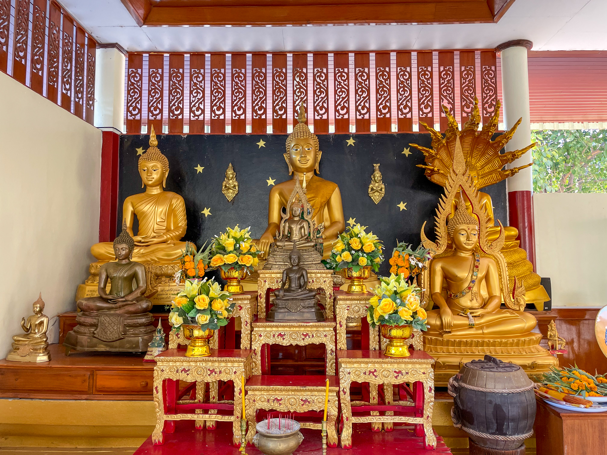 ๒. พระพุทธรูปโบราณอายุร้อยกว่าปี วัสดุไม้แกะสลัก ปางมารวิชัย ศิลปะช่างชาวบ้าน เดิมอยู่ในอุโบสถเก่า มีตั้งแต่ขนาดหน้าตักกว้าง ๙ นิ้ว ๗ นิ้ว ๕ นิ้ว และ ๓ นิ้ว รวมจำนวนสิบกว่าองค์