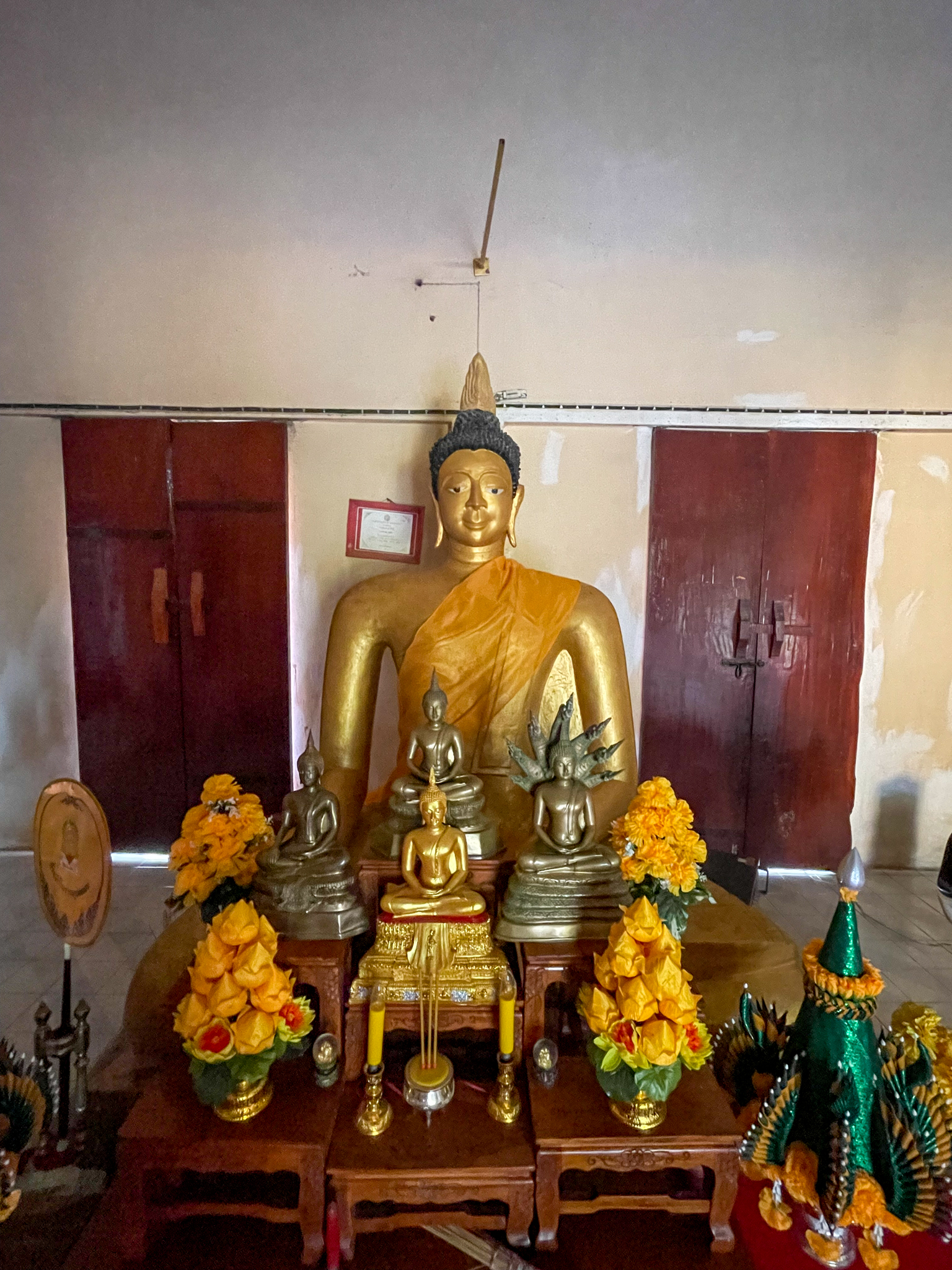๑. พระพุทธรูปประธานในอุโบสถ อายุ ๑๓๕ ปี ปางมารวิชัย วัสดุปูนปั้น ศิลปะช่างชาวบ้าน หน้าตักกว้าง ๑.๙๐ เมตร สูง ๒.๔๕ เมตร ฐานพระเดิมสูง ๒.๐๐ เมตร แต่เมื่อสร้างอุโบสถใหม่ครอบได้ถมส่วนฐานไว้ทั้งหมด