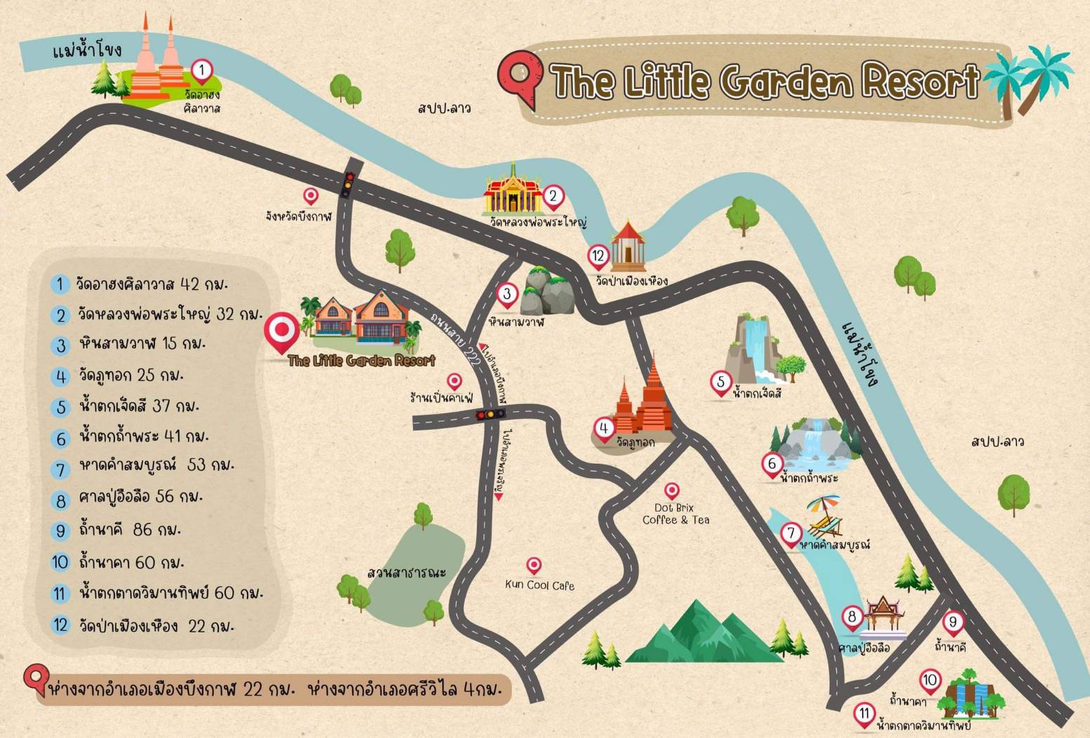 เดอะลิตเติ้ลการ์เดนท์รีสอร์ท The Little Garden Resort ห้องพักสวย บรรยากาศดี ใกล้ชิดธรรมชาติ ตั้งอยู่ที่ อำเภอศรีวิไล ห่างจากตัวจังหวัดบึงกาฬเพียง 26 กม. เท่านั้น พร้อมเครื่องอำนวยความสะดวก