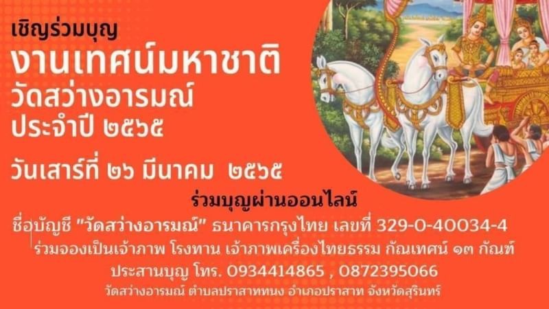 ดังนั้นทางวัดสว่างอารมณ์ จึงได้มีฏีกาบอกบุญมายังคณะสงฆ์ และพุทธศาสนิกชนทุกท่าน ผู้มีจิตศรัทธาในพระพุทธศาสนาได้ร่วมสร้างบุญสร้างกุศลร่วมบุญด้วยกัน ในงานเทศน์มหาชาติประจำปีในครั้งนี้ด้วย ดังกำหนดการตามวันและเวลาดังกล่าว และเชิญทุกท่านร่วมฟังเทศน์มหาชาติชาดก ๑๓ กัณฑ์ และทอดผ้าป่าสามัคคีประจำปีโดยพร้อมเพียงกัน