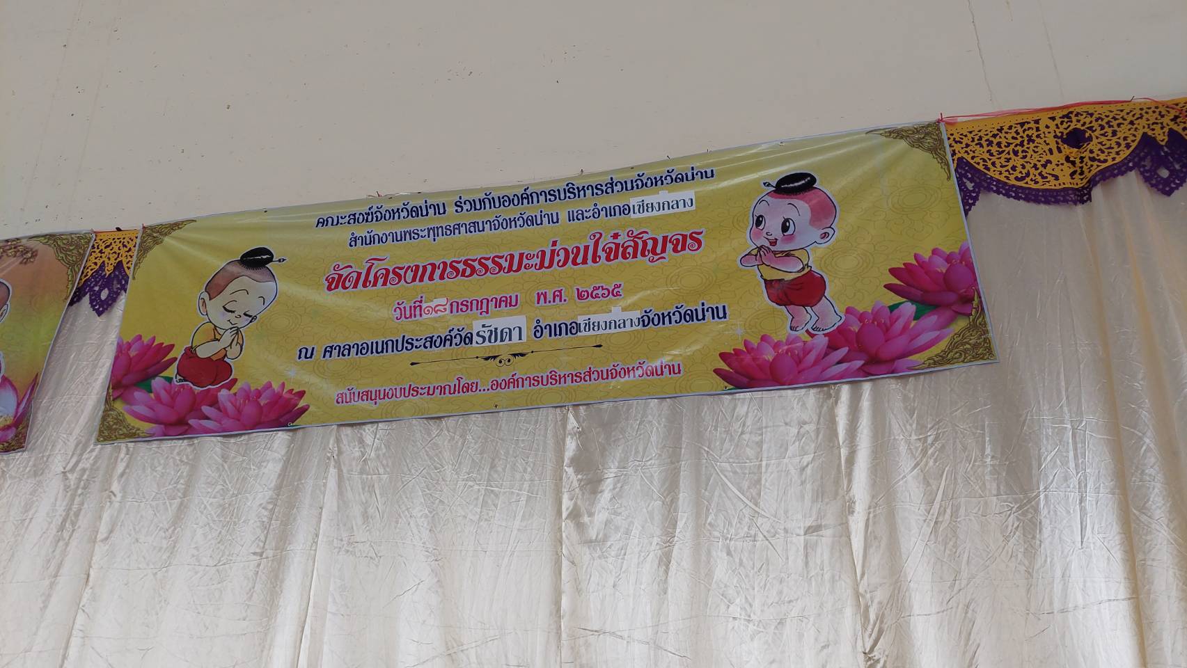 ๑๘ กค. ๖๕ เวลา ๐๙.๐๐ น. พระสุนทรมุนี รจจ.น่าน วัดมิ่งเมือง เป็นประธานเปิด และบรรยายให้ความรู้แก่ผู้เข้าอบรม ประกอบด้วยศาสนพิธีกร อาจารย์วัด ผู้นำท้องที่ ผู้นำท้องถิ่น ใน เขต อ.เชียงกลาง จากทุกตำบล โดยมีนายอำเภอเชียงกลางเป็นประธานฝ่ายคฤหัสถ์ โครงการอบรมศาสนพิธีกร ซึ่งเป็นงานภายใต้โครงการพัฒนาขีดความสามารถบุคลากรในพุทธศาสนา ของคณะสงฆ์จ.น่านโดยการสนับสนุนงบประมาณนาก อบจ.น่าน ณ วัดรัชดา อ.เชียงกลาง โครงการนี้จัดขึ้นโดย คณะสงฆ์ จ.น่าน ร่วมกับ คณะสงฆ์ อ.เชียงกลาง มี พระครูสิรินันทวิทย์ จอ.เมืองน่าน และ พระครูนันทชัยคุณจอ.เชียงกลาง เป็นผู้ดำเนินการโครงการ โครงการนี้ได้จัดขึ้นในทุกอำเภอ ขณะนี้ยังเหลืออีก ๓ อำเภอคือ อ.ท่าวังผา อ.แม่จริม อ.นาน้อย จะเสร็จสิ้นโครงการ ๓ ส.ค. ๖๕