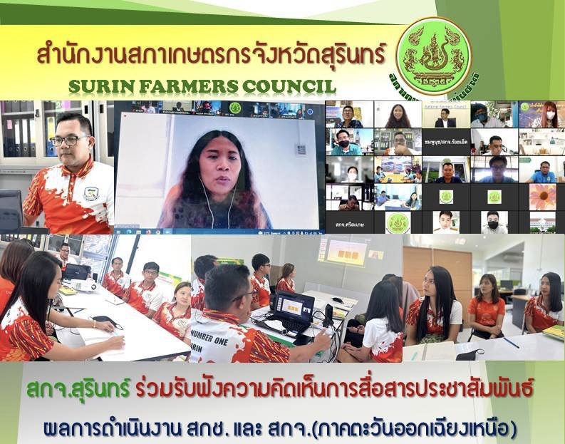 วันที่ 20 กรกฎาคม 2565 นายธงชัย พูดเพราะ หัวหน้าสํานักงานสภาเกษตรจังหวัดสุรินทร์ และเจ้าหน้าที่ สํานักงานฯ เข้าร่วมประชุมรับฟังความคิดเห็นการสื่อสารประชาสัมพันธ์ผลการดําเนินงานของสํานักงานเกษตรกรแห่ ชาติและสํานักงานสภาเกษตรจังหวัด ในรูปแบบออนไลน์ผ่านระบบประชุมทางไกล Zoom Meeting ณ ห้องประชุม สํานักงานสภาเกษตรกรจังหวัด สุรินทร์ เพื่อรวบรวมปัญหาความคิดเห็น และข้อเสนอแนะในการจัดทําสื่อประชาสัมพันธ์ ของ สกช. และ สกจ. ให้เหมาะสมแตกต่าง เป็นที่น่าสนใจของเกษตรกรและประชนทั่วไป ทั้งนี้ได้ร่วมกันสรุปแนวทางความ ร่วมมืออาชีพระหว่าง สกช. และ สกจ. (ภาคตะวันออกเฉียงเหนือ) และ Thai PBS ในการขับเคลื่อนทางยุทธศาสตร์ และ ขยายผลต่อใน สกจ.ทั้ง 77 จังหวัด