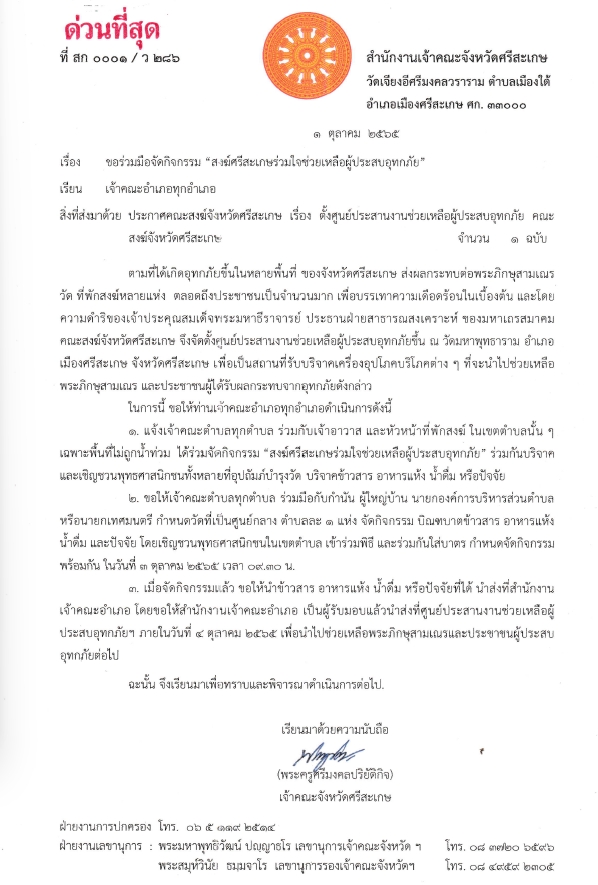 เรื่อง ขอร่วมมือจัดกิจกรรม “สงฆ์ศรีสะเกษร่วมใจช่วยเหลือผู้ประสบอุทกภัย”