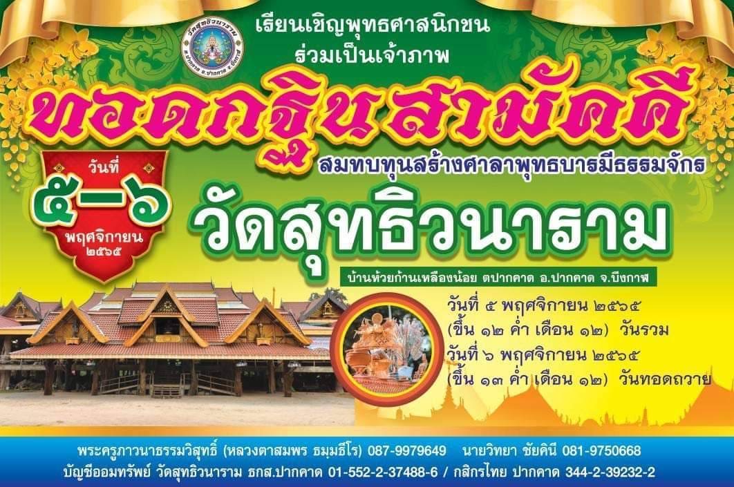 เรียนเขิญเป็นเจ้าภาพทอดกฐินสามัคคีสมทบทุนสร้างศาลาพุทธบารมีธรรมจักรวัดสุทธิวนาราม วันที่ 5-6 พฤศจิกายน 2565 ณ วัดสุทธิวนาราม บ้านห้วยก่านเหลืองน้อย ต.ปากคาด อ.ปากคาด จ.บึงกาฬ