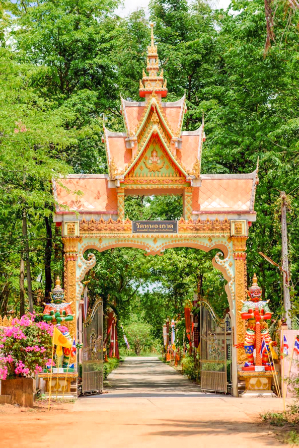 ๖. ซุ้มประตู ลักษณะทรงจตุรมุข ขนาดกว้าง ๒ เมตร ยาว ๕เมตร สูง ๑๓ เมตร โครงสร้างคอนกรีตเสริมเหล็ก เสาคอนกรีตเสริมเหล็ก