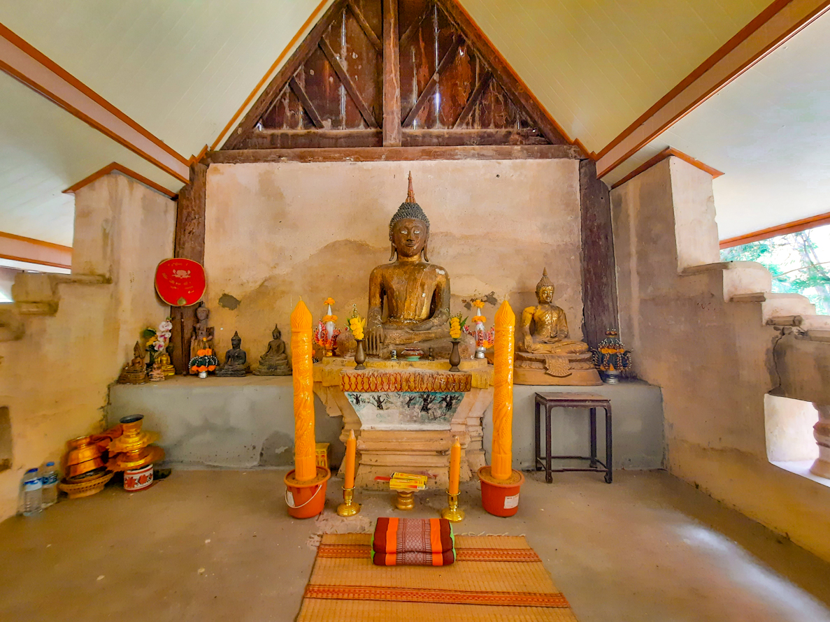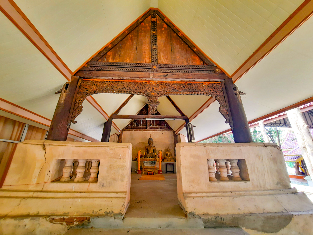 ๒. สิมครึ่งไม้ครึ่งปูนโบราณ รูปแบบเป็นสิมโถงหรือสิมโปร่ง ยกพื้นสูง โครงไม้ ก่ออิฐฉาบปูนก่อผนังโดยรอบ สูงประมาณ ๖๐ เซนติเมตร ผนังมีช่องประดับด้วยลูกมะหวด ด้านหน้าก่อบันไดปูน ๕ ชั้น มีการก่อปูน เทปูนใหม่ พระประธานปางมารวิชัย ขัดสมาธิราบ สร้างด้วยปูนบนฐานชุกเชิงคานหน้าบันรวงผึ้งแกะไม้สวยงาม