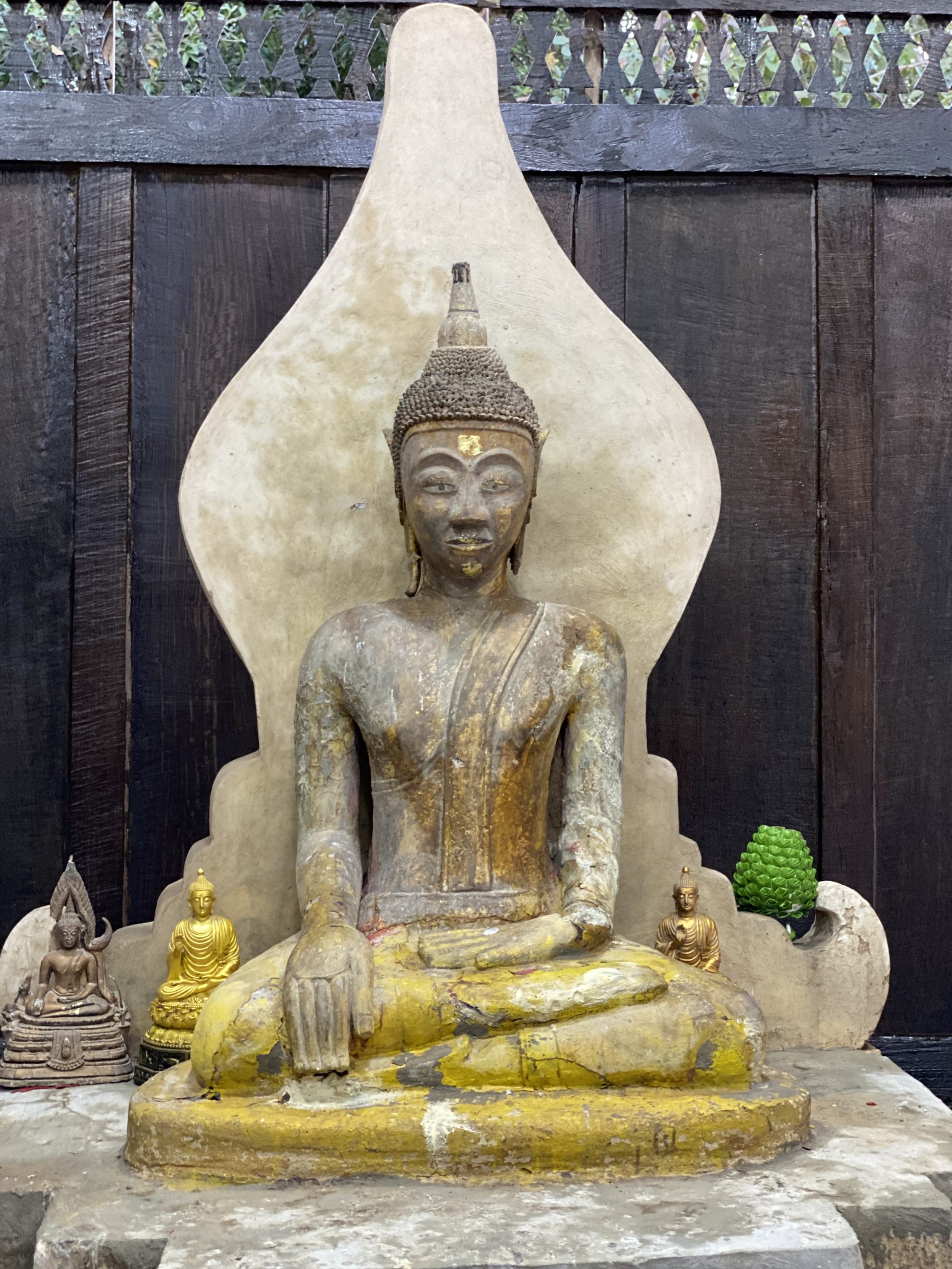 ๑. สิมไม้โบราณ รูปแบบเป็นสิมโถงหรือสิมโปร่ง พระประธานปางมารวิชัยนั่งขัดสมาธิราบบนฐานเอวขัน ก่อด้วยปูน ศิลปะอีสานพื้นบ้าน มีสัดส่วนที่ลงตัวสวยงามมาก เรือนสิม เป็นสิมโถงแบ่งเป็น ๓ ส่วน ส่วนที่ ๑-๒ เป็นส่วนยื่นออกมา เพื่อให้พระสงฆ์นั่งทําพิธีกรรมทางศาสนา ส่วน ๓ เป็นส่วนที่ประดิษฐานพระประธาน จึงมีการทำผนังด้วยไม้ มีหน้าต่างฝั่งละช่อง ด้านหลังพระประธาน ๑ ช่อง เพื่อให้แสงลอดผ่าน วงกบมีการประดับลายแกะไม้ด้วย ในช่วงที่พระอาจารย์ปลัดศรีเป็นเจ้าอาวาสนั้นยอดพระธาตุได้หักลงมาเนื่องจากวัสดุต่าง ๆ ทรุดโทรมเสื่อมคุณภาพ พระอาจารย์ปลัดศรีจึงได้รวมกลุ่มชาวบ้านเก็บพระเครื่องต่าง ๆ ที่ตกออกมาจากยอดพระธาตุมารวมกันไว้ได้ ๒ ถาดใหญ่ และอีกจํานวนหนึ่งชาวบ้านเก็บไปบูชาที่บ้าน ส่วนยอดพระธาตุที่เป็นเศวตฉัตรทำจากเหล็กเก็บกองไว้ที่ฐานพระธาตุ