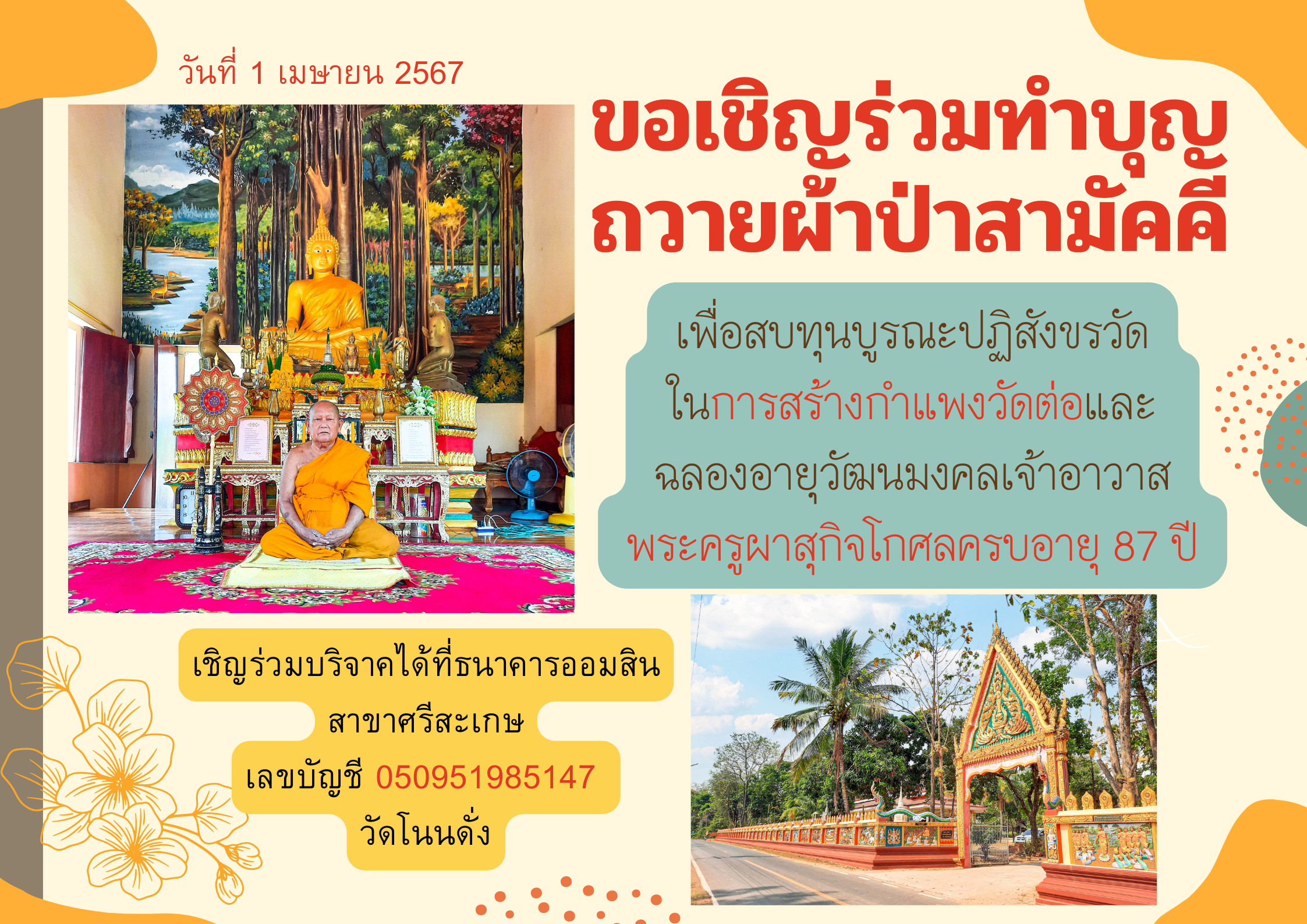 ขอเชิญร่วมทำบุญถวายผ้าป่าสามัคคีเพือสบทุนบูรณะปฏิสังขรวัดในการสร้างกำแพงวัดต่อและฉลองอายุวัฒนมงคลเจ้าอาวาสพระครูผาสุกิจโกศลครบอายุ87ปี