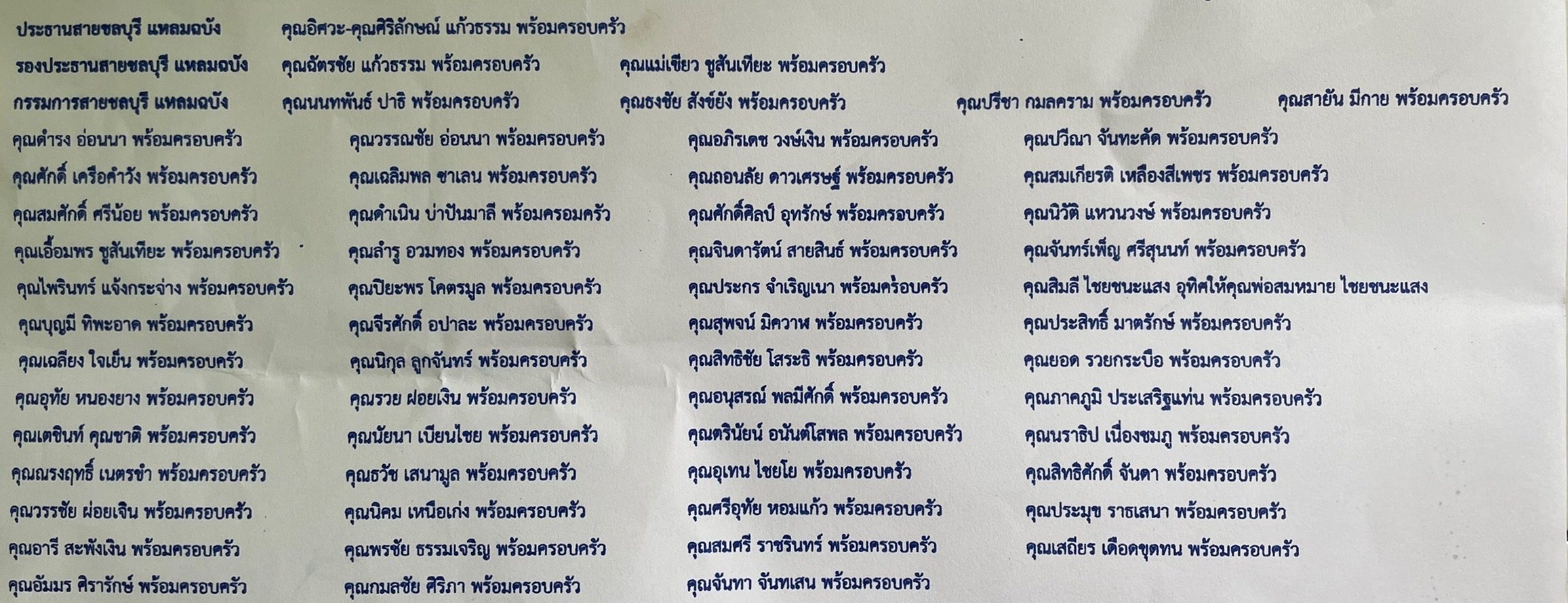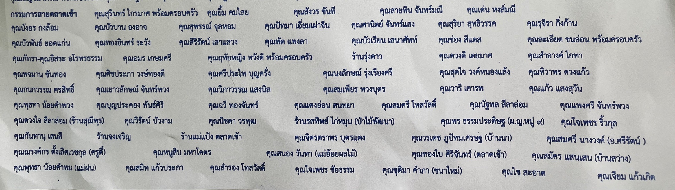 ขออำนาจคุณพระศรีรัตนตรัยและสิ่งศักดิ์สิทธิ์ทั้งหลาย จงดลบันดาลให้ท่านผู่ร่วมบริจาคทั้งครอบครัว ญาติมิตร จงประสบแต่ความสุข ความเจริญทุกทิพราตรีกาลเทอญ