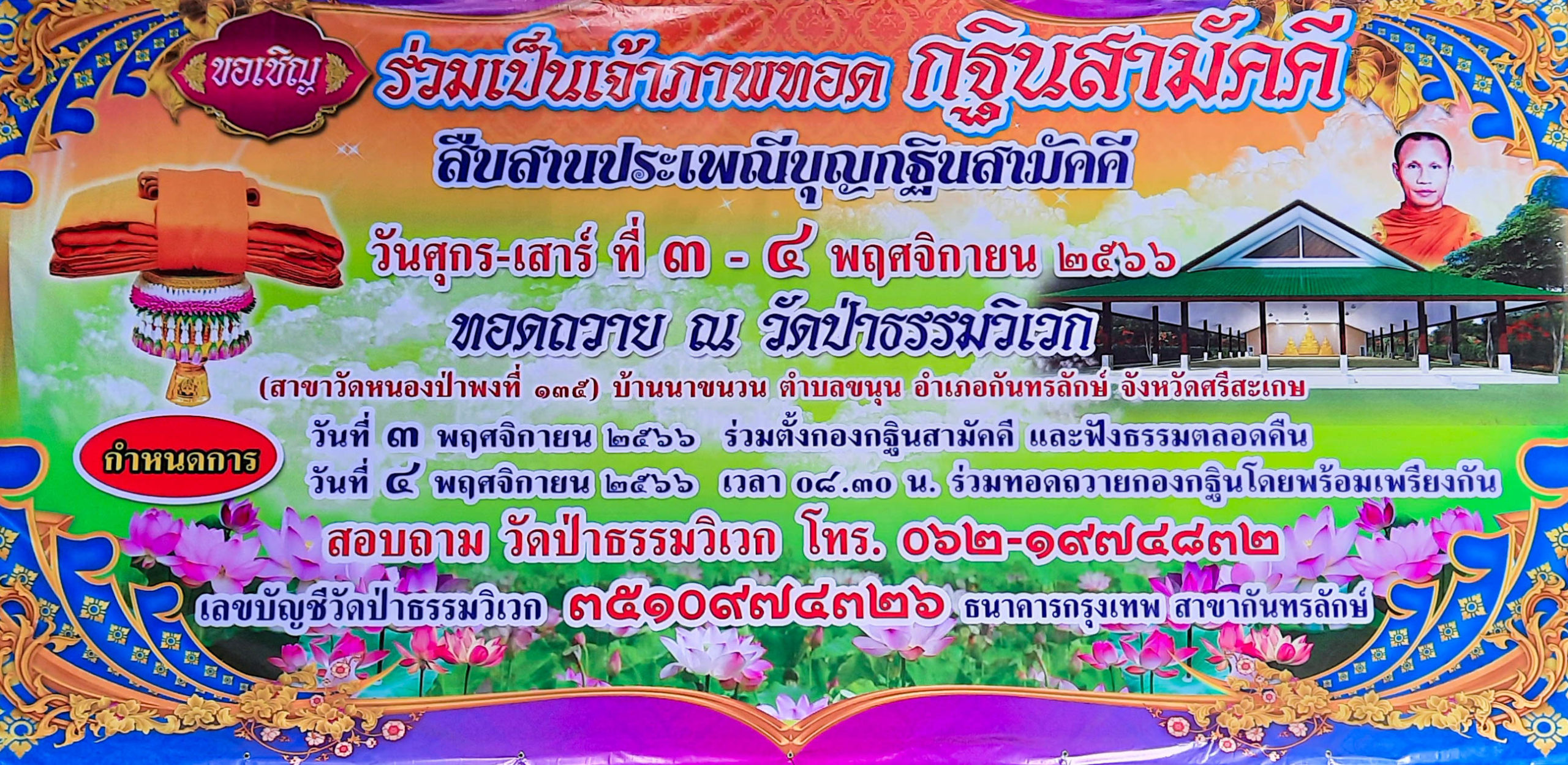 กำหนดการ วันที่ ๓ พฤศจิกายน ๒๕๖๖ ร่วมตั้งกองกฐินสามัดดี และฟังธรรมดลอดคืน