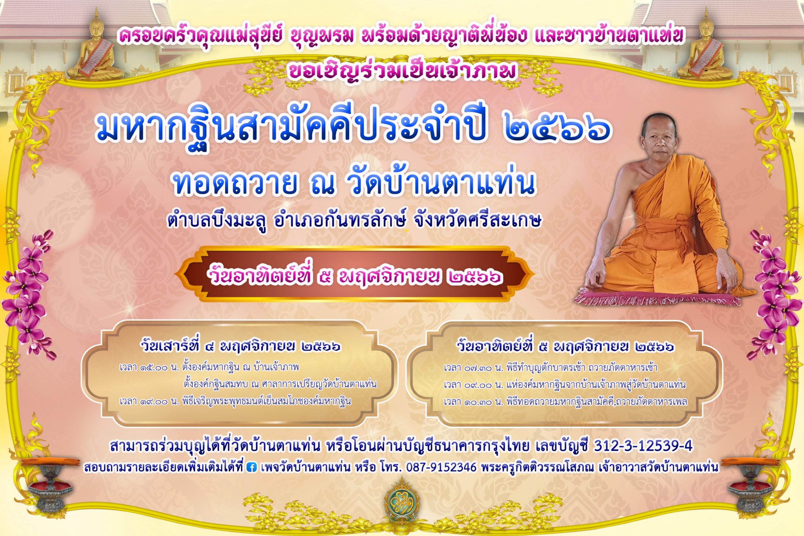 หรือ โทร 087-9152346 พระครูกิตติวรรณโสภณ เจ้าอาวาสวัดบ้านตาแท่น