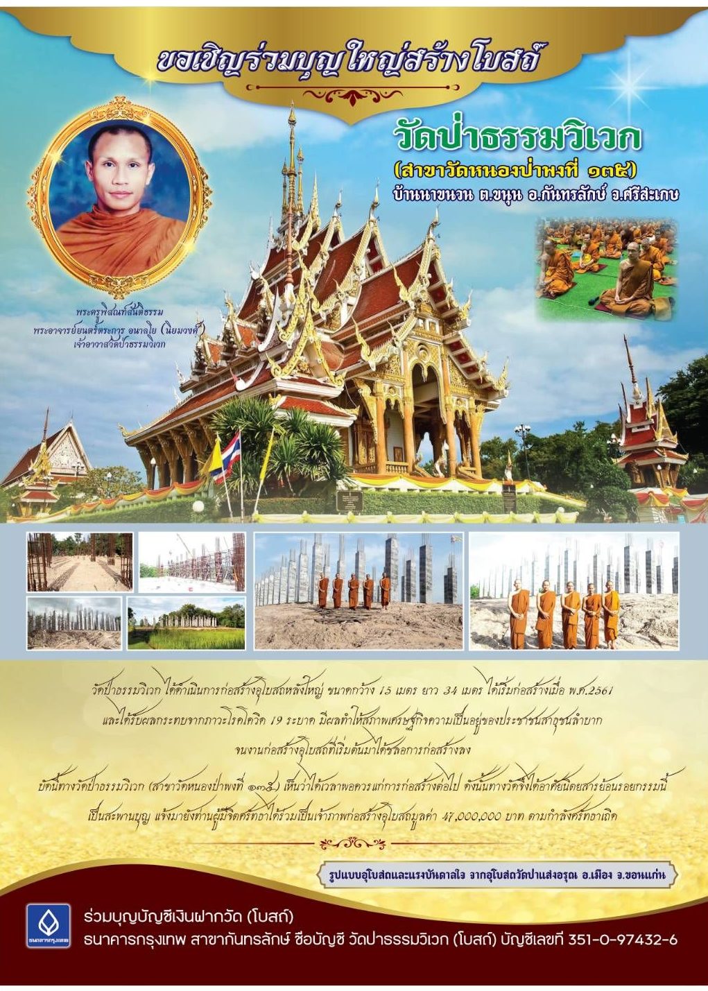 บัดนี้ทางวัดป่าธรรมวิเวก (สาขาหนองป่าพงที่ 135) เห็นว่าได้เวลาพอควรแก่การก่อสร้างต่อไป ดังนั้น ทางวัดจึงขอเรียนเชิญผู้มีจิตศรัทธาทุกท่านได้ร่วมเป้นเจ้าภาพก่อสร้างอุโบสถมูลค่า 47,000,000 บาท ตามกำลังศรัทธาเถิด
