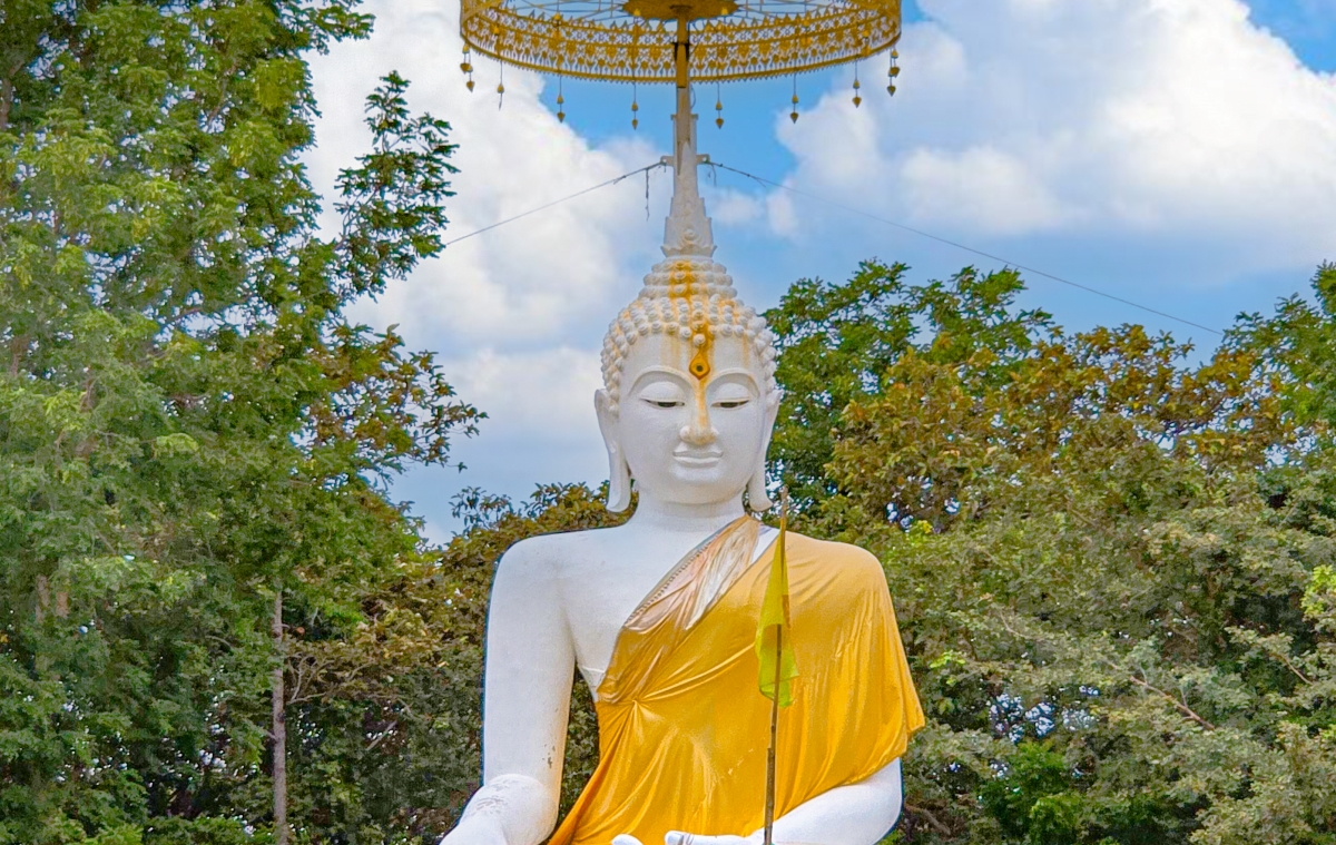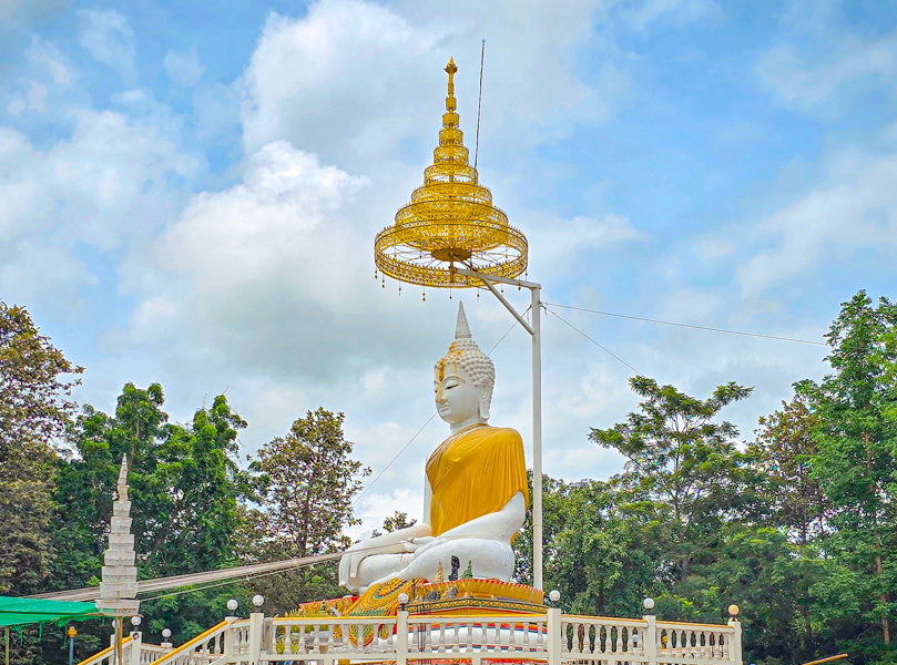 สร้างขึ้นเมื่อวันอาทิตย์ที่ ๒๔ มิถุนายน ๒๕๕๐ ขึ้น ๑๐ ค่า เดือน ๘ โดยความดำริของคุณภนกพร คุณคมธนัตถ์ สุขทรจื่น พร้อมคณะชมรมคนรักศีลธรรม ประสงค์ที่จะสร้าง พระพุทธรูปประดิษฐาน ณ วัดป่าสุขสมบูรณ์ ต.สองชั้น อ.กระสัง จ.บุรีรัพย์ คุณคมธนัตย์ จึงได้ประสานงานทางโทรศัพท์ มายังพระอาจารย์สมบูรณ์ วิสุทโธ ประธานสงฆ์วัดป่าสุขสมบูรณ์ และตกลงที่จะสร้าง ณ วัดป่าสุขสมบูรณ์ โดยคุณกนกพร ขอเรียกชื่อพระพุทธรูปองค์นี้ร่า หลวงพ่อขาว พระอาจารย์สมบูรณ์ วิสุทโธ และคณะกรรมการวัด พร้อมทั้งชาวบ้านก็ยินดีเป็นอย่างยิ่ง ได้กำหนดฤกษ์ ให้เริ่มดำเนินการก่อสร้าง ฐานองค์พระ ในวันจันทร์ที่ ๑๔ พฤษภาคม ๒๕๕๐ แรม ๑๓ ต่ำ เดือน ๖ โดยมีนายช่างบัญญัติ ชุมเย็น ดูแลการสร้าง การก่อสร้างดำเนินไปด้วย ความเรียบร้อย ได้รับความร่วมมือจากทุกคนเป็นอย่างดี ไม่ว่าจะเป็นเด็ก เยาวชน คนแก่ คนเฒฆ่า ต่างก็มา ร่วมลงแรงสร้างฐานพระดัวยจิตศรัทธา อย่างแรงกล้า จนฐานขององค์พระสำเร็จเรียบร้อย ด้วยดีและทำพิธีหล่อองคพระในวันอาทิตย์ที่ ๒๔ มิถุนายน ๒๕๕๐ ขึ้น ๑๐ ค่ำ เดือน ๘ เสร็จในวันเดียว ที่เศียรบรรจุพระบรมสารริกธาตุ มีพุทธศาสนิกชนร่วมเขปูนสร้างหลวงพ่อขาว หลายพันคน ตั้งเต็นสวดมนต์ แปดทิศ มีพระเถระนั่งภาวนาปรกทั้งแปดทิศ และมี พุทธศาสนิกชนนั่ง สวดมนต์ภาวนาทั้งแปดทิศ จนแล้วเสร็จในเวลา ๑๖.๑๔ นาที สร้างฐานแปดเหลี่ยม สองขั้นรองรับ วันที่ ๓๐ มกราคม ๒๕๕๙ พระอาจารย์สมบูรณ์ วิสุทโธ ได้นำพานุขธศาสนิกชน และออกแบบขยายพื้นที่การสร้างเพิ่มเติม มีจัตร ๙ ชั้น เสาหงส์ รั้วรอบ พุทธอุทยานแมปอริยมรรคองศ์แปด โดยมีกลุ่มคณะโครงการวัดบันดาลใจ เป็นผู้ออกแบบ เสร็จเมื่อวันที่ ๒๔ มกราคม ๒๕๖๐