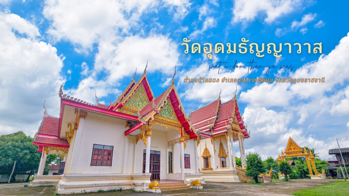วัดอุดมธัญญาวาส ตั้งอยู่เลขที่ ๖๗ บ้านทม หมู่ที่ ๕ ตำบลบ้านแดง อำเภอตระการพืชผล จังหวัดอุบลราชธานี สังกัดคณะสงฆ์มหานิกาย ที่ดินตั้งวัดมีเนื้อที่ ๕ ไร่ ๑ งาน ๗๐ ตารางวา น.ส. ๓ เลขที่ ๖๓๖