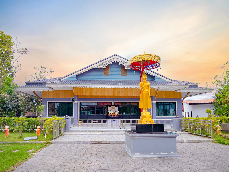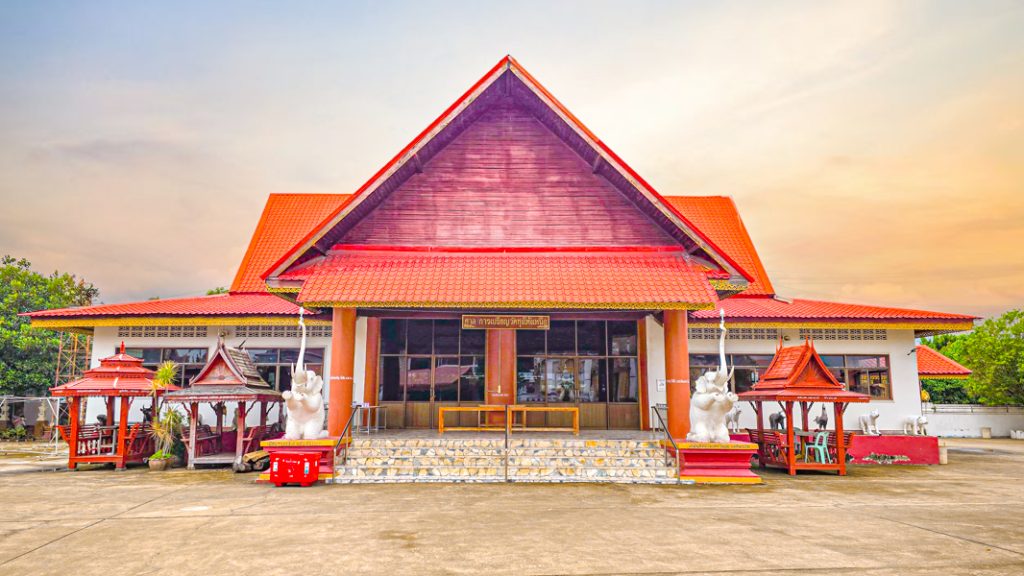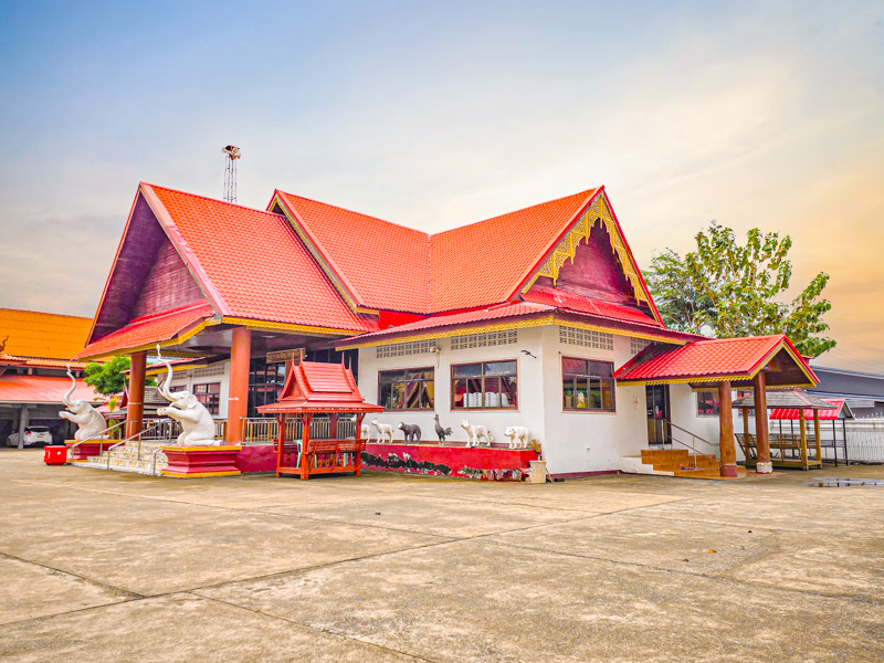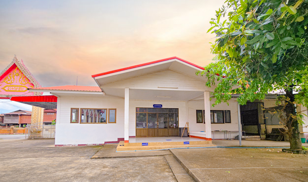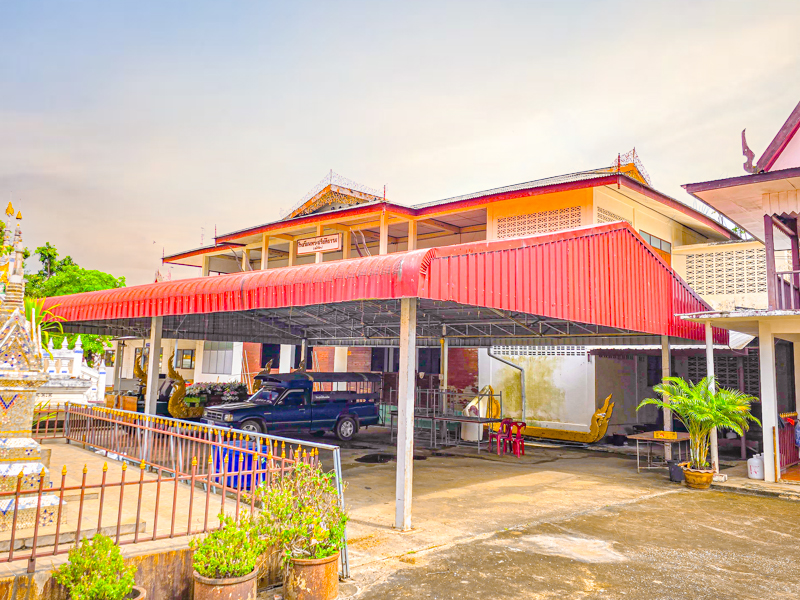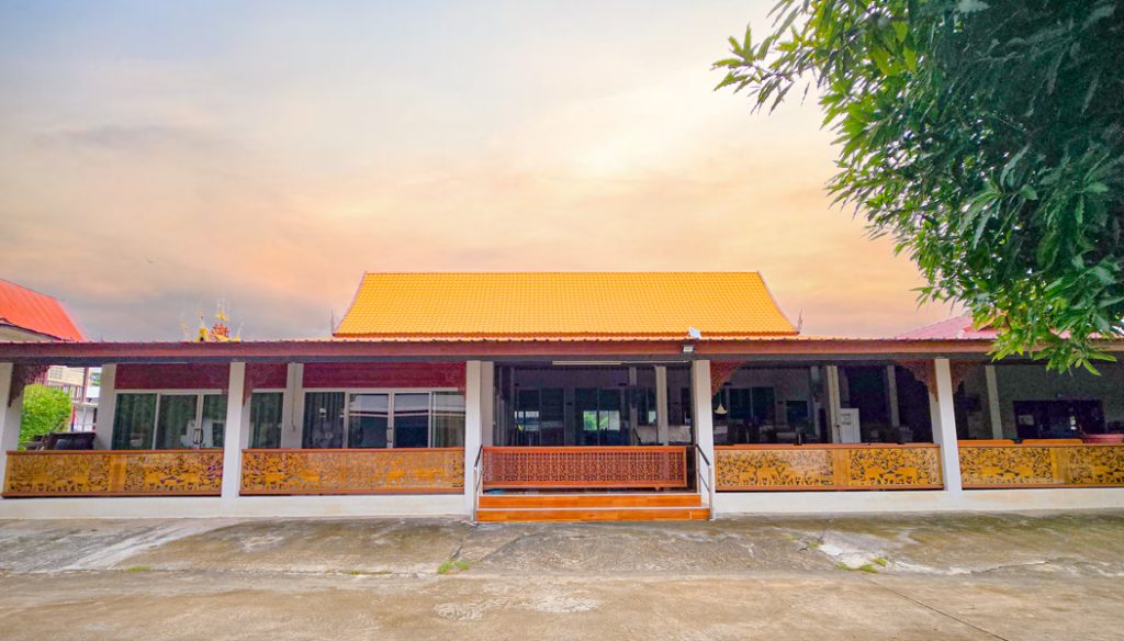 ศาลาอเนกประสงค์ กว้าง ๑๑ เมตร ยาว ๒๑ เมตร เป็นอาคารครึ่งตึกครึ่งไม้
