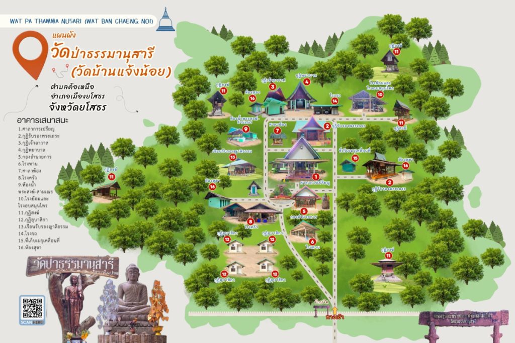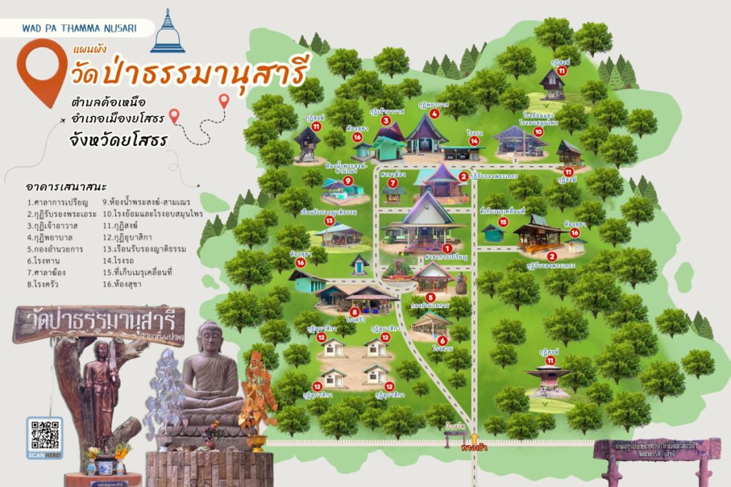 วัดป่าธรรมานุสารี (สาขาที่ ๙๘ วัดหนองป่าพง) ๘๒ หมู่ที่ ๑๒ ตำบลค้อเหนือ อำเภอเมืองยโสธร จังหวัดยโสธร